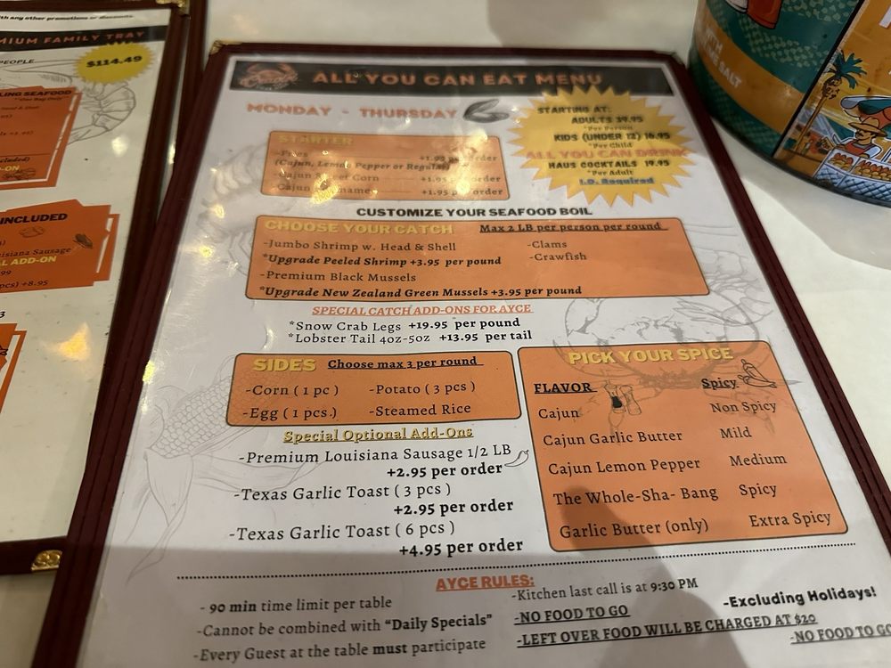 “ We took our family on a Friday night after hearing about this place on Instagram. We enjoyed all of the food and the family tray was more than enough for all of us. We got the shrimp, peeled shrimp, green muscles, snow crab legs and added the lobster tail. The food came out fast and it was delicious, we enjoyed a good kick so we got it spicy and it was perfect with the potatoes, sausage and corn. They also have plenty of drink options. We tried their different margaritas and they were delicious. The location did get busy later in the day but there is plenty of space and the staff is on top of everything. Would recommend this place for anyone looking for a seafood boil. Make sure to ask for extra lemons and salt and pepper, we pour it on the parchment paper and squeeze the lemon so you can dip your shrimp in it. ”